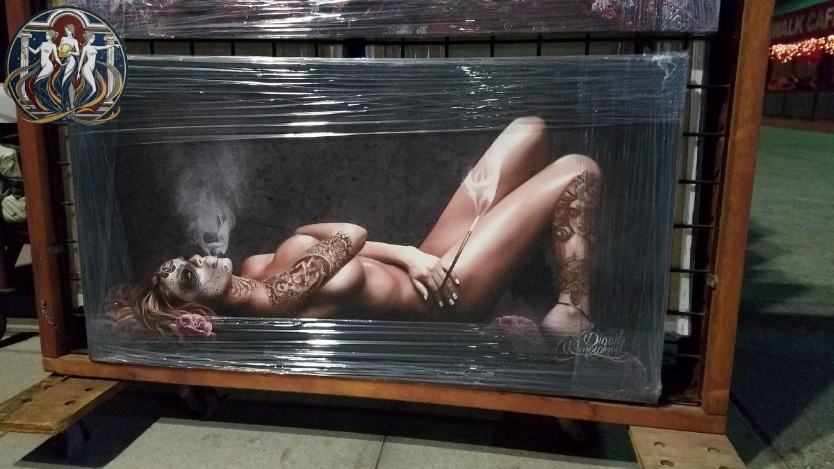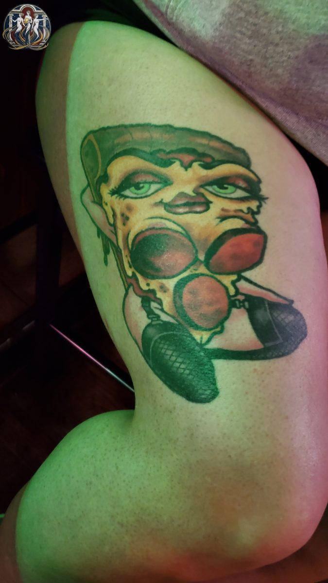 Thigh tattoo featuring the wearer’s chosen name: Pizza Slut.